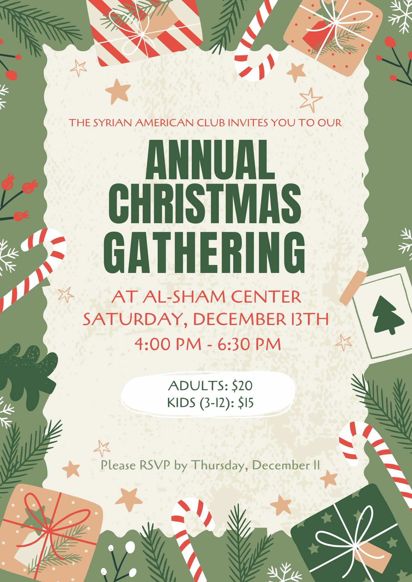 SAC's annual Christmas Gathering with snacks, games for children, and a special visit from our very own Santa.